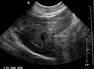 Abdominal ultrasound shows both kidneys are enlarged with irregular margins and perirenal hypoechoic rims. Both renal cortices are also mottled in appearance with ill-defined multiple hypoechoic nodules. A small amount of aggregation of gravity-dependent hyperechoic sediment is present within the urinary bladder (not pictured).