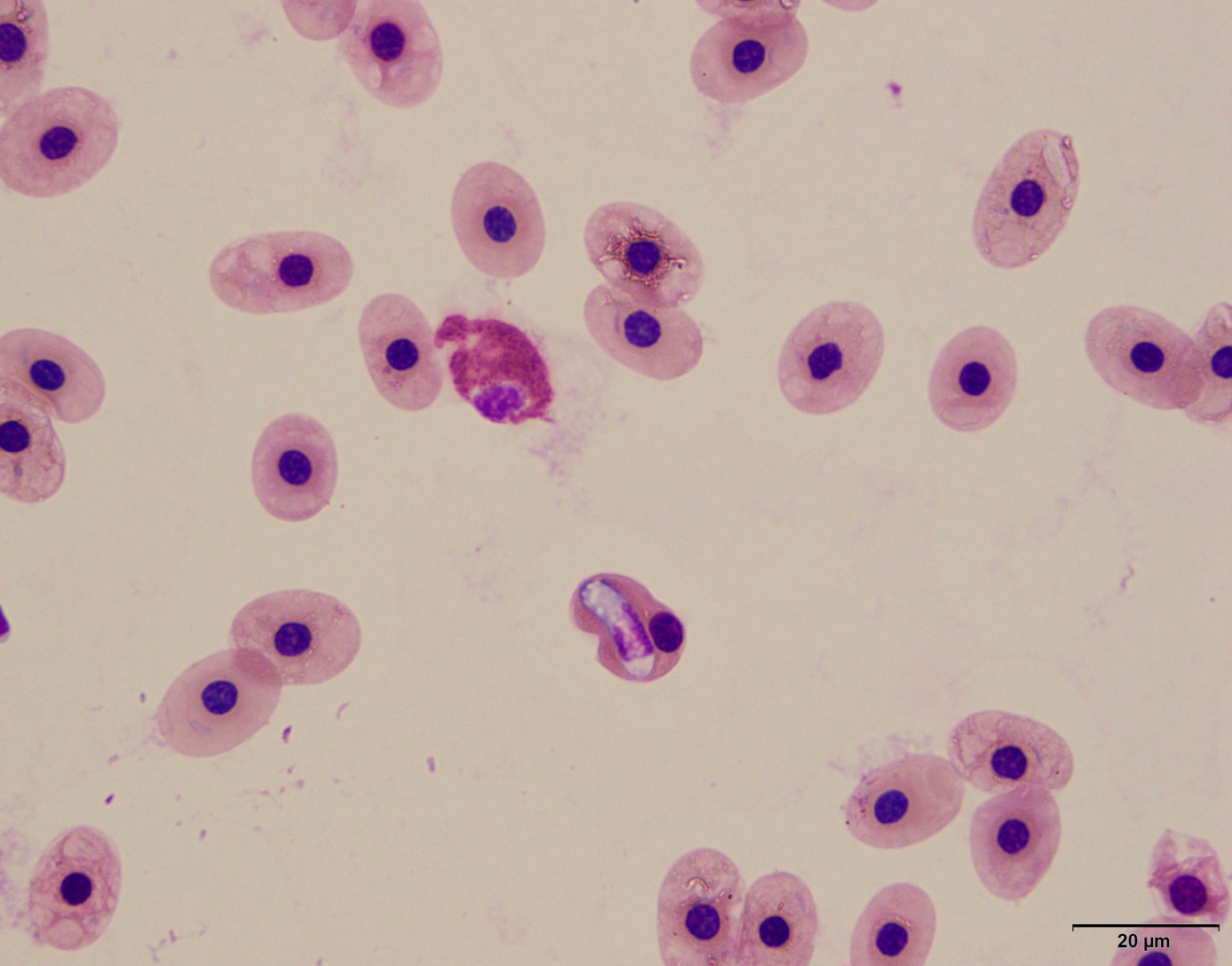A blood smear is ordered, and results are shown. Based on the image of the patient's blood smear below, what is the most likely identity of the intraerythrocytic organism?