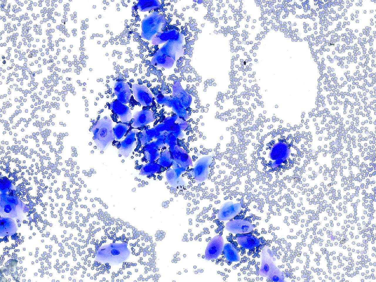 A fine-needle biopsy of the mass is obtained. Cytology of the mass returns and is shown.