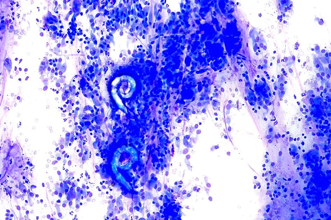 A transoral wash is obtained. A slide prepared for cytologic evaluation is shown: