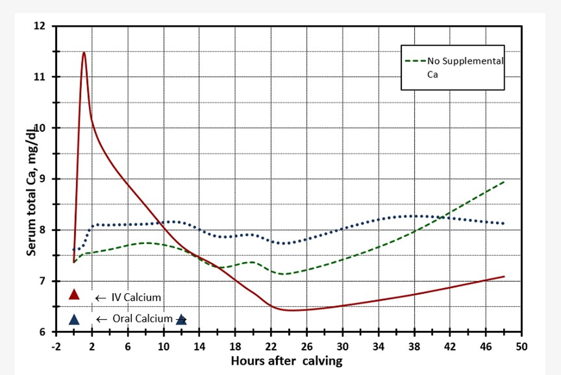 The prophylactic use of IV calcium for preventing hypocalcemia is discouraged. Cows supplemented with IV calcium at calving experience substantial hypocalcemia by 24 hours post calving (see serum calcium concentration image), which persists until at least 48 hours post calving and likely much longer.