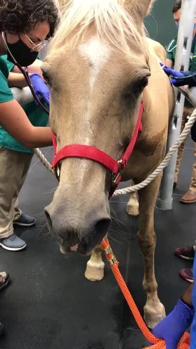Video of a 19-year-old American Quarter Horse gelding diagnosed with severe asthma (summer pasture associated). This video is at presentation. Horse is demonstrating marked nasal flare and increased expiratory effort.