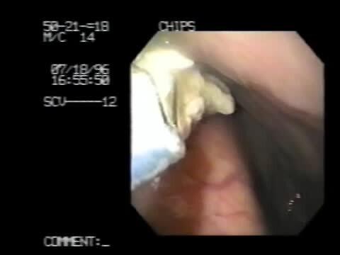 Video of a single chondroid in the right guttural pouch. The chondroid is removed using a snare designed for use with the videoendoscope.