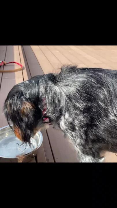 A juvenile male Brittany exhibiting dysphagia (difficulty swallowing) while drinking, a common clinical sign of X-linked dystrophin-deficient muscular dystrophy. The dog was examined because of failure to grow, progressive exercise intolerance, and dysphagia.