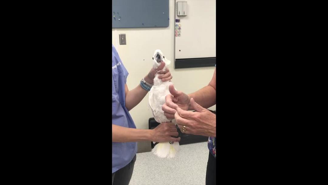 Demonstration of physical examination procedures, crop palpitation, and Keel scoring of a sulfur-crested cockatoo.