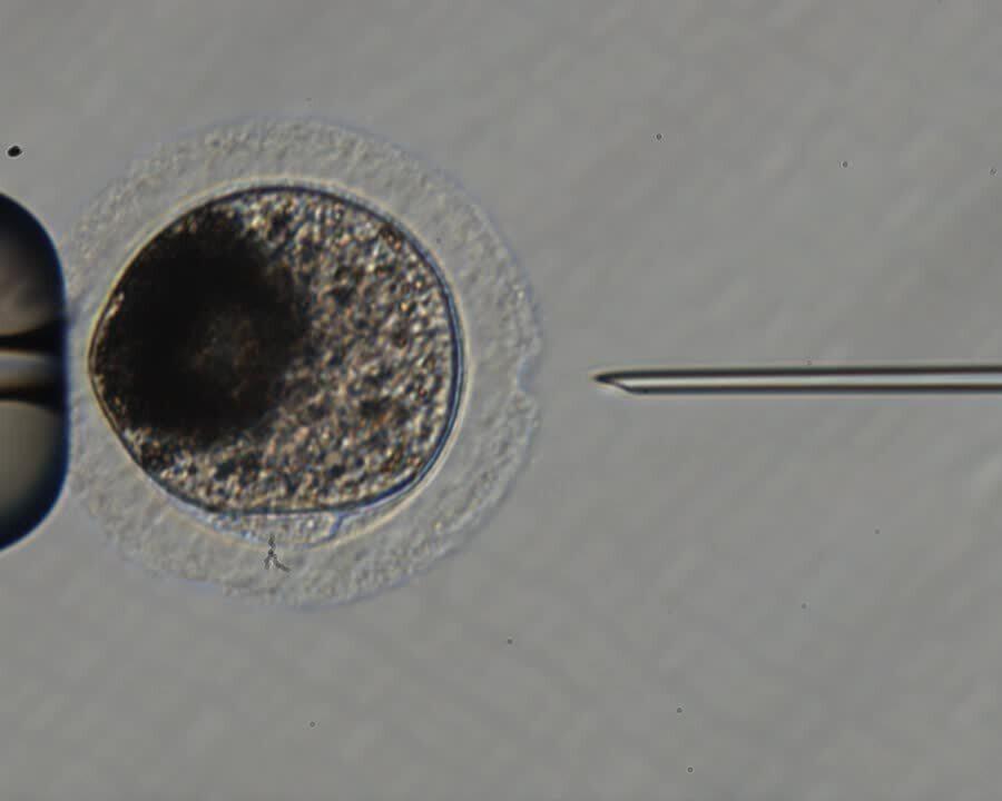 Video of one mature oocyte being subjected to intracytoplasmic sperm injection (ICSI). The laser is applied to the zona pellucida to facilitate sperm injection.