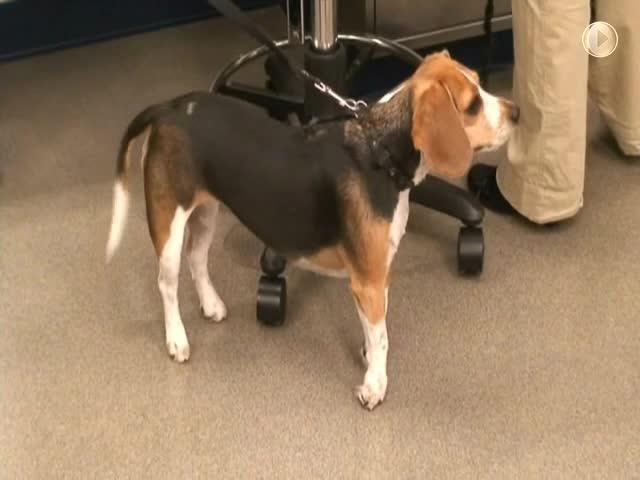 Beagle with Musladin-Lueke syndrome. Note the characteristic stiff gait in which the animal walks on the distal tips of her toes due to contractures. The broad facial features with wide-set eyes are also apparent. Not easily seen is a characteristic cartilage fold on the inner pinnae.