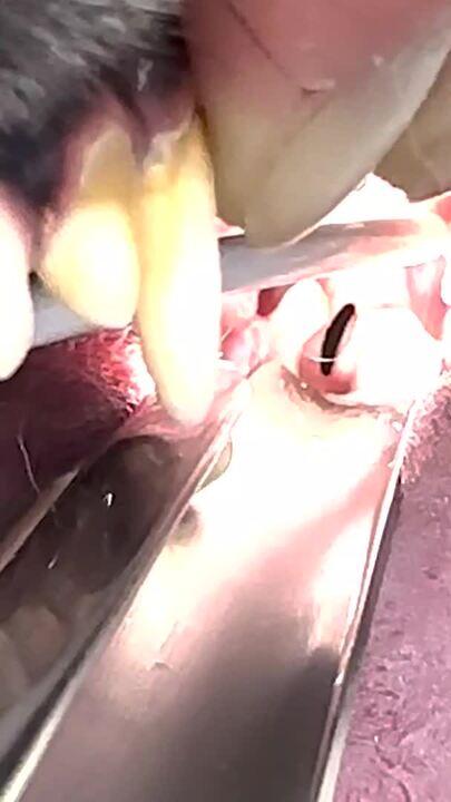 Laryngeal examination of a dog with polymyositis. Laryngeal paresis from muscular weakness is evident in the poor adduction of the arytenoid cartilage.