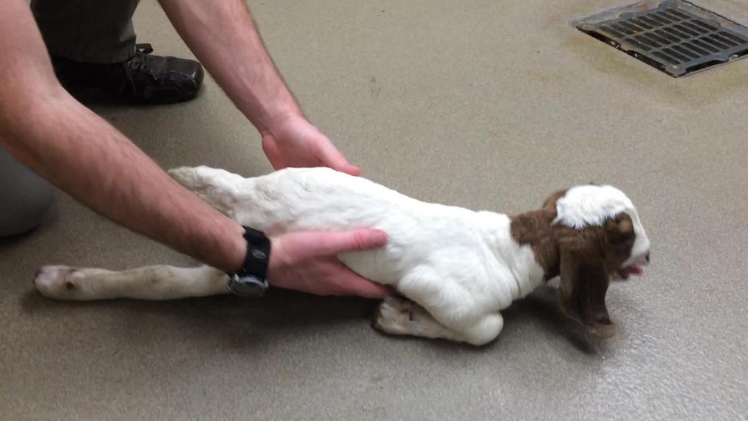 Young Boer goat kid with white muscle disease. The patient can move its legs normally but is too weak to stand. CK and AST concentrations were elevated on serum biochemical evaluation. The goat was quickly responsive to injectable vitamin E / selenium and was able to stand and nurse within 24 hours.