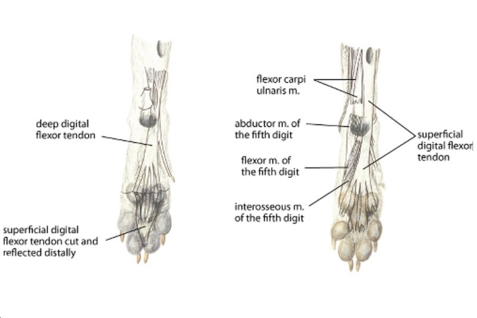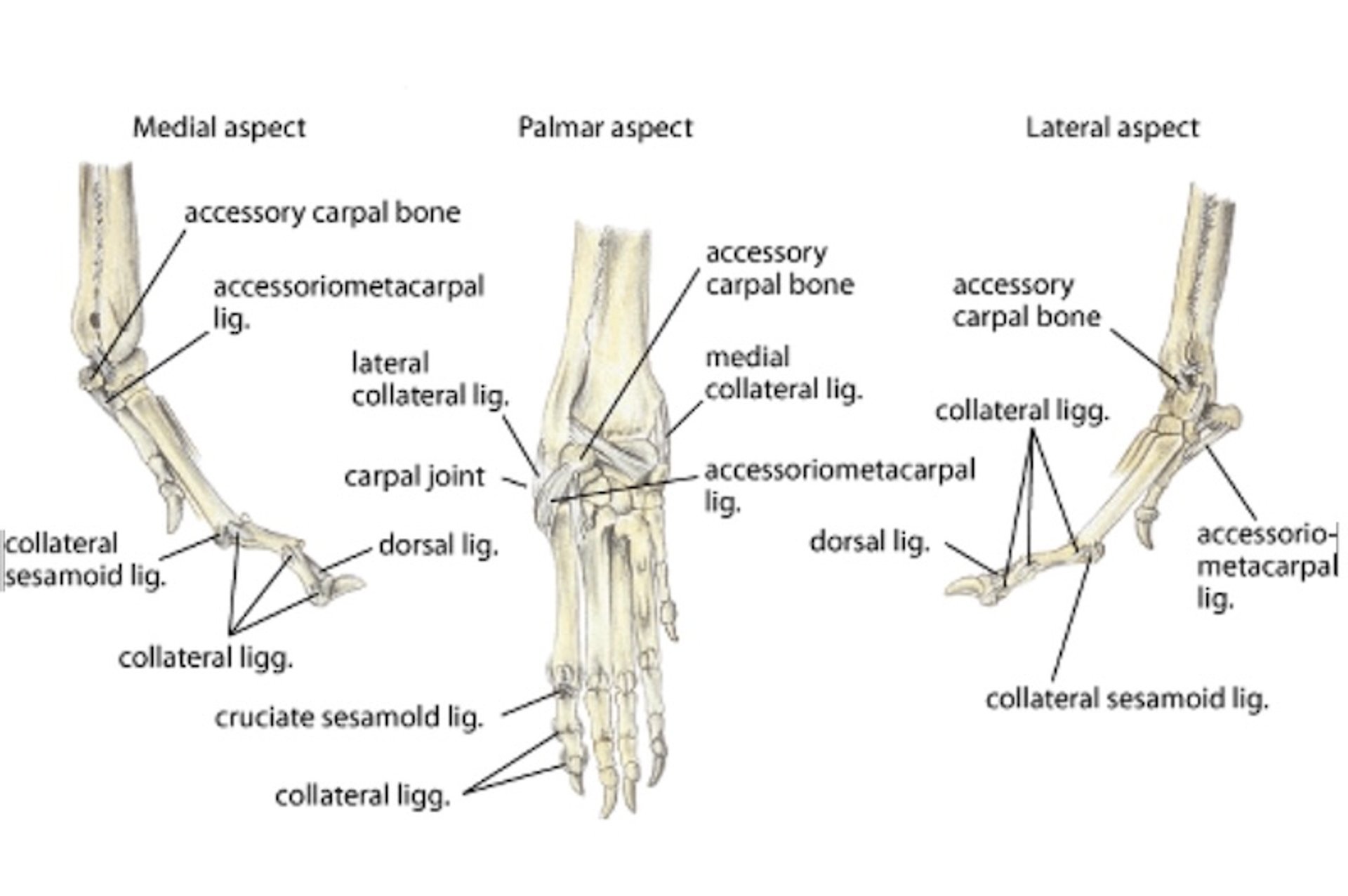 Palmar carpal breakdown in dogs and cats is a hyperextension injury secondary to falls or jumps that produces excessive force on the carpus, leading to collapse of the proximal, middle, and/or distal joints as a result of tearing of the palmar carpal ligaments and fibrocartilage (see distal forelimb osteoarticular structures and paw tendons and muscles diagrams).