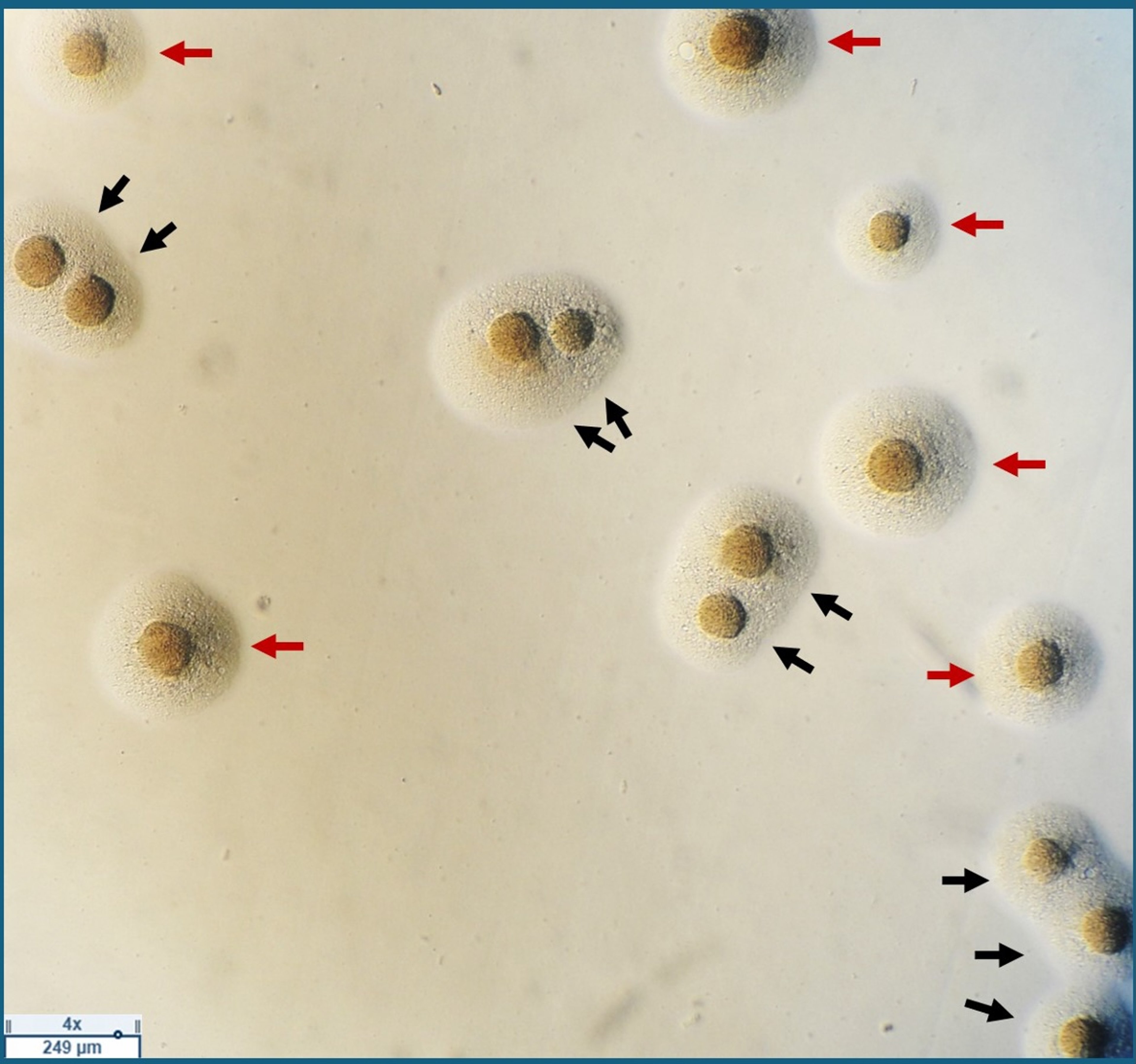 The small (0.1–1 mm diameter) colony morphology typically has a "fried egg" appearance under low magnification (see photomicrograph of Mycoplasma colonies).